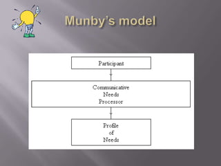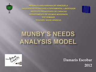 This document outlines a framework for analyzing English for specific purposes (ESP) with 7 categories: 1) purpose, 2) setting, 3) interaction, 4) instrumentality, 5) dialect, 6) target level, and 7) communicative event. It then applies this framework to analyze ESP for social science students, identifying key communicative events like lectures, seminars, and exams. It also discusses specifying an ESP syllabus by focusing on micro-skills, micro-functions, and linguistic forms. Finally, it summarizes criticisms of ESP models for lacking consistency and a clear link to syllabus design.