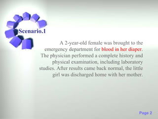 This document describes two scenarios involving cases of potential Munchausen syndrome by proxy (MSBP). Scenario 1 describes a mother bringing her daughter to the emergency room twice for blood in her diaper, becoming agitated and insisting on a second opinion before taking the daughter home against medical advice. Scenario 2 describes a mother whose son experienced repeated life-threatening apnea episodes that only she witnessed and that persisted despite medical interventions, until video surveillance caught her smothering her son to induce the episodes. The document then provides facts about MSBP, including that it usually involves mothers harming their own children for attention from medical professionals. Diagnosis is difficult as the child's symptoms are inconsistent or undetectable, and the caring