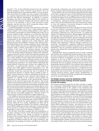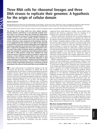 This document proposes a hypothesis for the origin of the three cellular domains of life - Archaea, Bacteria, and Eukarya. It suggests that independent transfers of DNA viruses to existing RNA cells gave rise to the three domains. Each transfer stabilized a different version of the proteins involved in translation. The existence of three different founder DNA viruses also explains why each domain has distinct DNA replication machinery. This model aims to address weaknesses in other models and explain why informational proteins differ across domains.