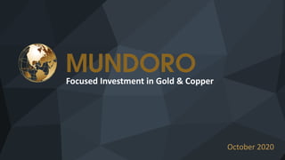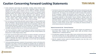 Mundoro's presentation discusses its focused investment strategy in gold and copper, outlining the company's forward-looking information regarding metal prices, economic outlook, and exploration projects in Serbia and Bulgaria. The document details the risks associated with mining and the uncertainty surrounding mineral resource estimates, emphasizing the need for further exploration to confirm these resources. Mundoro aims to generate revenue through strategic partnerships and royalties while maintaining a commitment to sustainable resource management and community engagement.