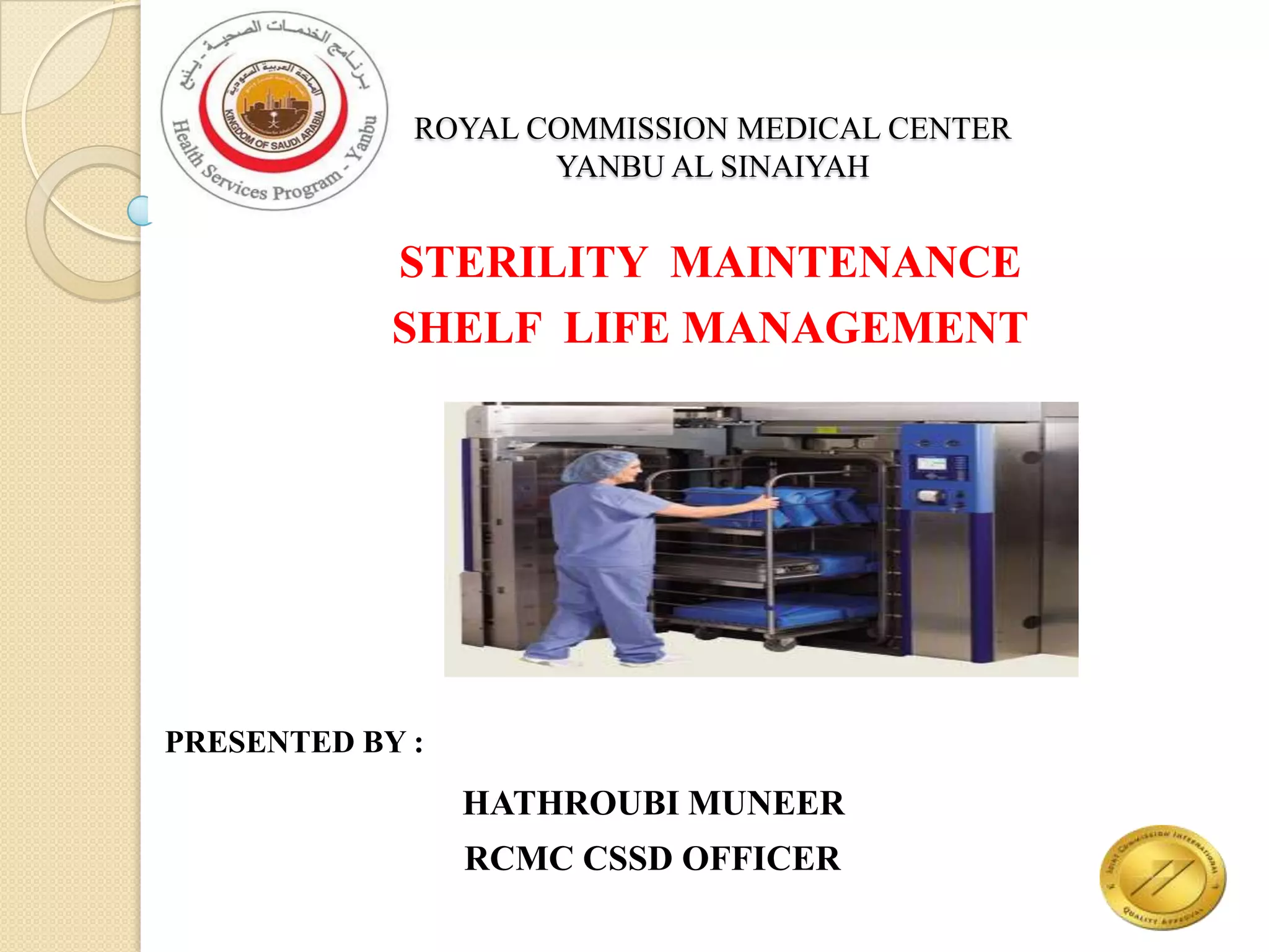 The document discusses sterility maintenance and shelf life management. It covers topics such as material requirements for sterile packaging, packaging system design validation processes, and maintaining sterility and shelf life. Specifically, it emphasizes the importance of using cellulose fibers rather than linen for packaging due to linen's absorbency which can allow contamination. It also notes that double sequential wrapping provides better barrier protection than single wrapping.