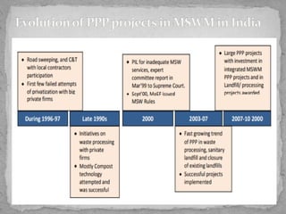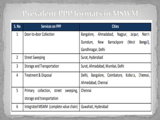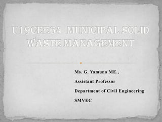 This document outlines the key topics covered in a course on municipal solid waste management. It includes 5 units that will impart knowledge on sources and characteristics of municipal solid waste, concepts of reduction, reuse and recycling, methods of collection and transfer, processing techniques, and disposal methods such as sanitary landfilling. The course objectives are to understand the nature of municipal solid wastes and issues in management from an integrated perspective, and to plan and design systems for storage, collection, transport, processing and disposal of wastes.