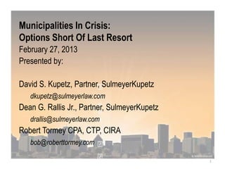 This document provides an overview and summary of municipal fiscal crises in California. It discusses the large unfunded pension liabilities faced by state and local governments, guidance for elected officials on proactively addressing fiscal issues, the purpose and advantages of declaring a fiscal emergency or filing for Chapter 9 bankruptcy protection. It also introduces the presenters, who are legal and financial experts on municipal restructuring.