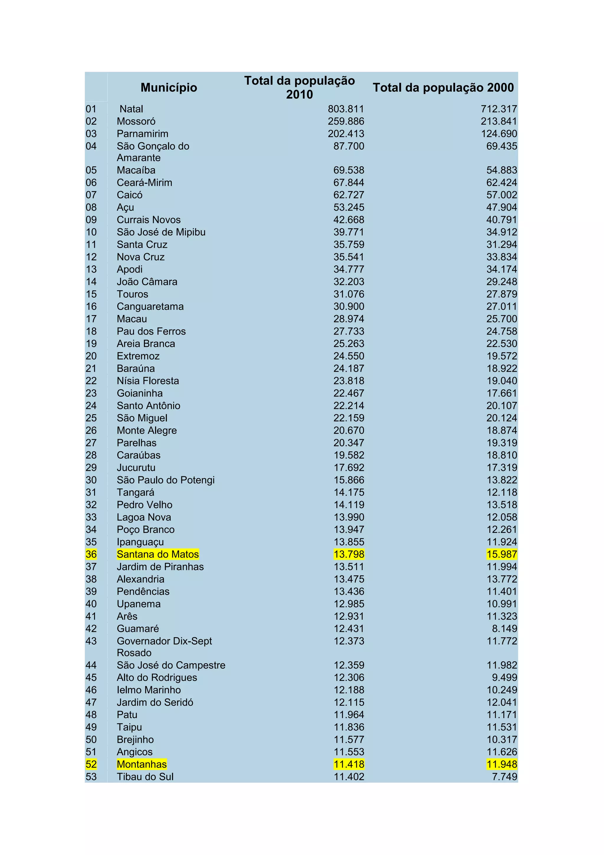 This document provides population data for 166 municipalities in Rio Grande do Norte, Brazil for the years 2010 and 2000. It shows the total population for each municipality for both years, with Natal having the highest population in 2010 of 803,811 and Mossoró having the second highest population of 259,886 in 2010. Overall, the total population of Rio Grande do Norte was 3,168,133 in 2010.
