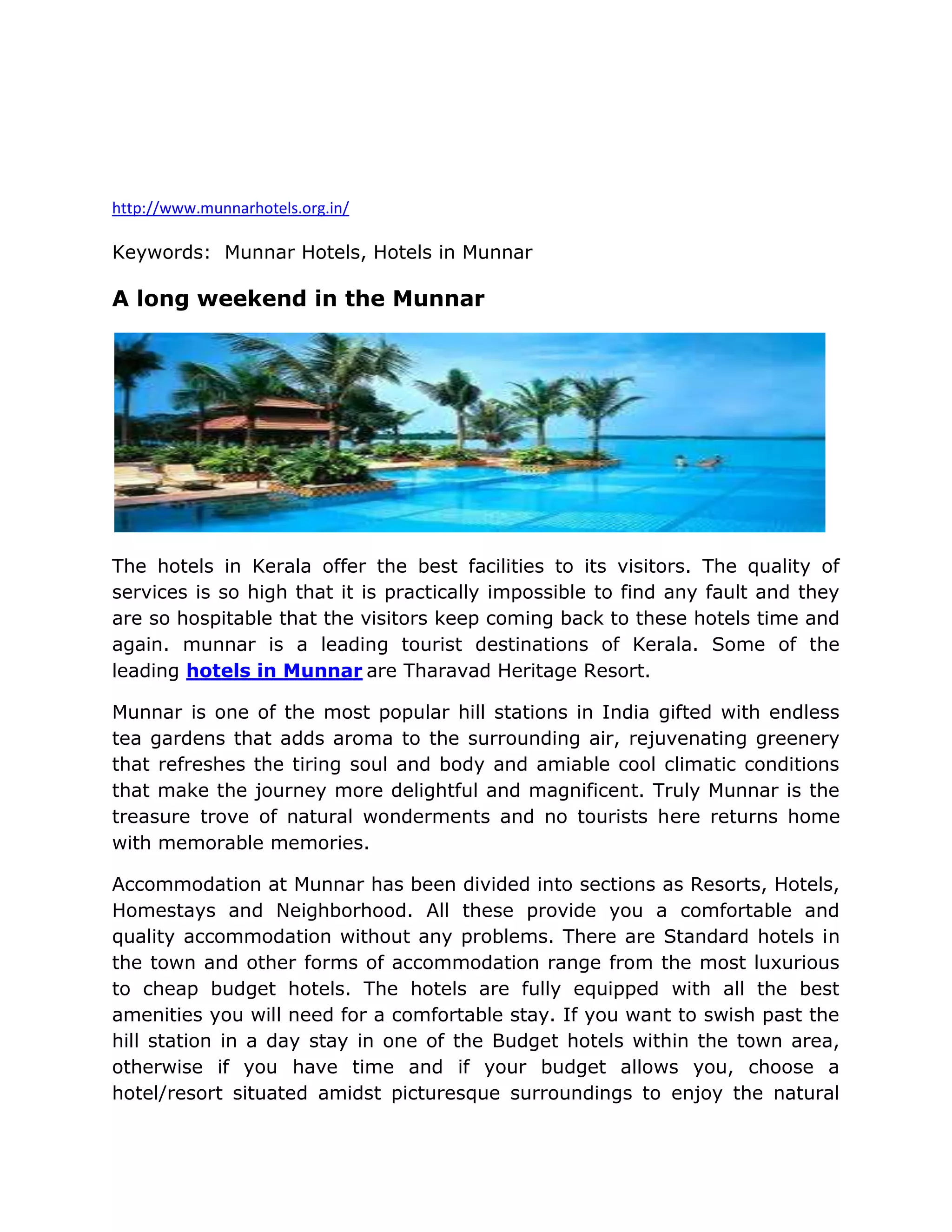 Munnar is a popular hill station in Kerala, India known for its tea gardens and natural beauty. The hotels in Munnar offer high quality services and facilities, ensuring visitors have a comfortable stay. Accommodation options range from luxury resorts to budget hotels. Many hotels are located amidst the scenic surroundings so guests can enjoy Munnar's tranquil atmosphere.