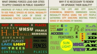This document discusses driving forces that lead cities to change public squares and open spaces. It notes that currently many public spaces are underused and create social inequality due to a lack of inviting features like trees, benches, lighting and food places. Renovating and upgrading public spaces with more amenities can provide economic benefits by increasing public usage, diminishing social inequality, and creating gathering places that give people a greater sense of belonging to the city.