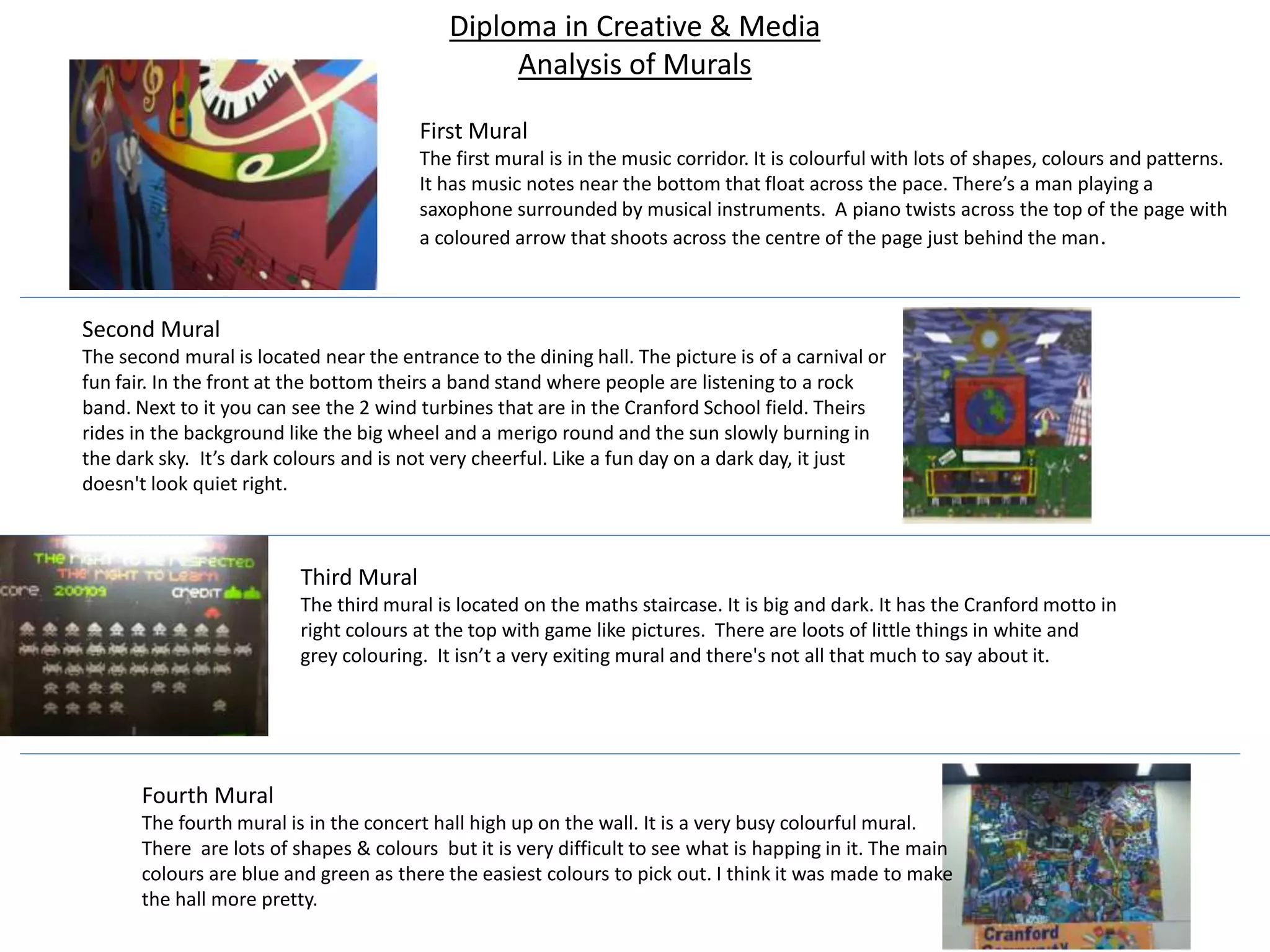 The document summarizes four murals located at Cranford School. The first mural is in the music corridor and features colorful shapes, music notes, and a saxophone player surrounded by instruments. The second mural near the dining hall entrance depicts a carnival scene with rides and a rock band, but uses dark colors that don't convey the intended cheerful atmosphere. The third large mural on the math staircase includes the school motto but has few distinguishing details. The fourth busy mural in the concert hall is difficult to discern due to many shapes and colors, but uses mainly blue and green hues.