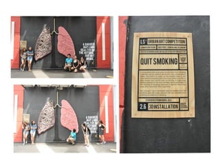The document summarizes three murals created by different artists to communicate messages. The first mural by Chua Chi Yan aims to raise awareness about endangered hippopotamuses and uses augmented reality. The second by Syafiq Rasyid Abdul Jalil is a 3D installation titled "Quit Smoking" that depicts damaged lungs to discourage smoking. The third mural by Kenji Chai uses an orangutan mother and child to metaphorically represent the struggles of single mothers in Malaysia.