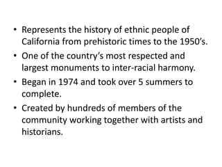 The Great Wall of Los Angeles represents the history of ethnic people in California from prehistoric times to the 1950s. Created by hundreds of community members working together with artists and historians over 5 summers, it stands as one of the largest and most respected monuments to inter-racial harmony in the country. Several of the murals depict important historical events like the forced removal of residents from Chavez Ravine to build Dodger Stadium or highlight themes like the strengths of Latino women and the need to preserve the environment.