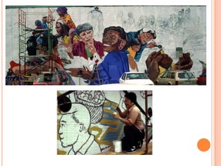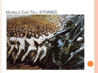 The document discusses different types of murals and what they can represent. It mentions that murals can tell stories, be based on words, just be for fun, have hidden messages, or be about topics like hip hop, politics, or history. Murals can involve professional artists working with youth, have themes, and follow a process that includes drawing out the design, painting it in full color, and celebrating when complete.