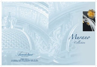 Документ содержит описание люстр и настольных ламп, произведенных компанией arredo luce s.r.l., с указанием их характеристик, размеров, мощности и отделки. Все изделия имеют отделку из хрусталя и золота, а также изготавливаются из стекла мурано. Предоставлены детали по каждому продукту, включая технические характеристики и дизайн.