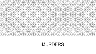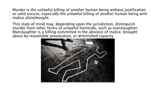 Murder is the unlawful killing of another human being. Laws and punishments for murder vary by country, with some sentencing murderers to as little as 10-15 years in prison. Manslaughter is a lesser charge distinguished by an absence of malice or diminished mental capacity.