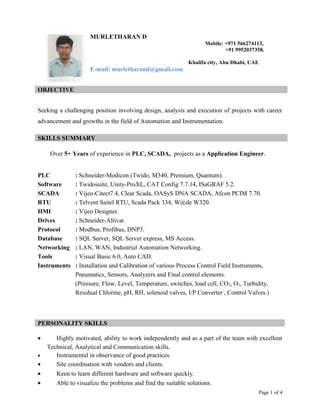 Murletharan D is seeking a position involving automation and instrumentation projects. He has over 5 years of experience as an application engineer working with PLCs, SCADAs, and DCS systems. Some of the projects he has worked on include pipeline monitoring systems in Abu Dhabi and Mumbai. He has skills in programming PLCs and designing SCADA graphics as well as commissioning control systems.