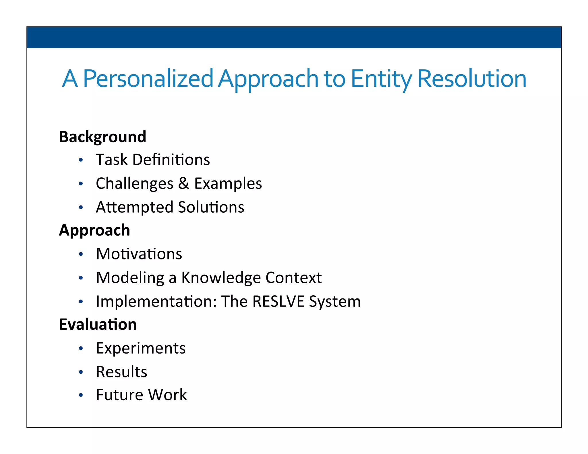 The document presents RESLVE, a personalized approach to entity disambiguation focused on enhancing the recognition of ambiguous entities in short texts, particularly in social media. It discusses challenges such as the shortness and noise of tweets and limitations of traditional techniques that fail in such contexts, while proposing a model that utilizes user-specific semantic data to improve accuracy. Experiments and future work are also outlined to evaluate and refine the RESLVE system.