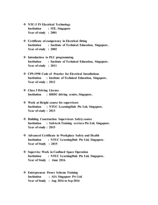 Veeramuthu Muruganandam is seeking a job utilizing his strong electrical and mechanical skills as well as experience in water treatment operations, facility and technical support, and electrical and instrumentation works. He has over 18 years of work experience including as a production senior engineer at Microdyn-Nadir Singapore and has qualifications in electrical technology, PLC programming, confined space operation, and workplace safety and health.
