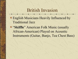 The document discusses the British Invasion of the 1960s when British bands like the Beatles made a big impact on American culture. It outlines the rise of the Beatles from their early days playing skiffle music through their experimental phase in the late 1960s. It also discusses other key British bands that emerged during this time period like the Rolling Stones and their role in popularizing blues music internationally.