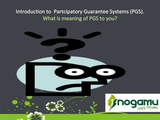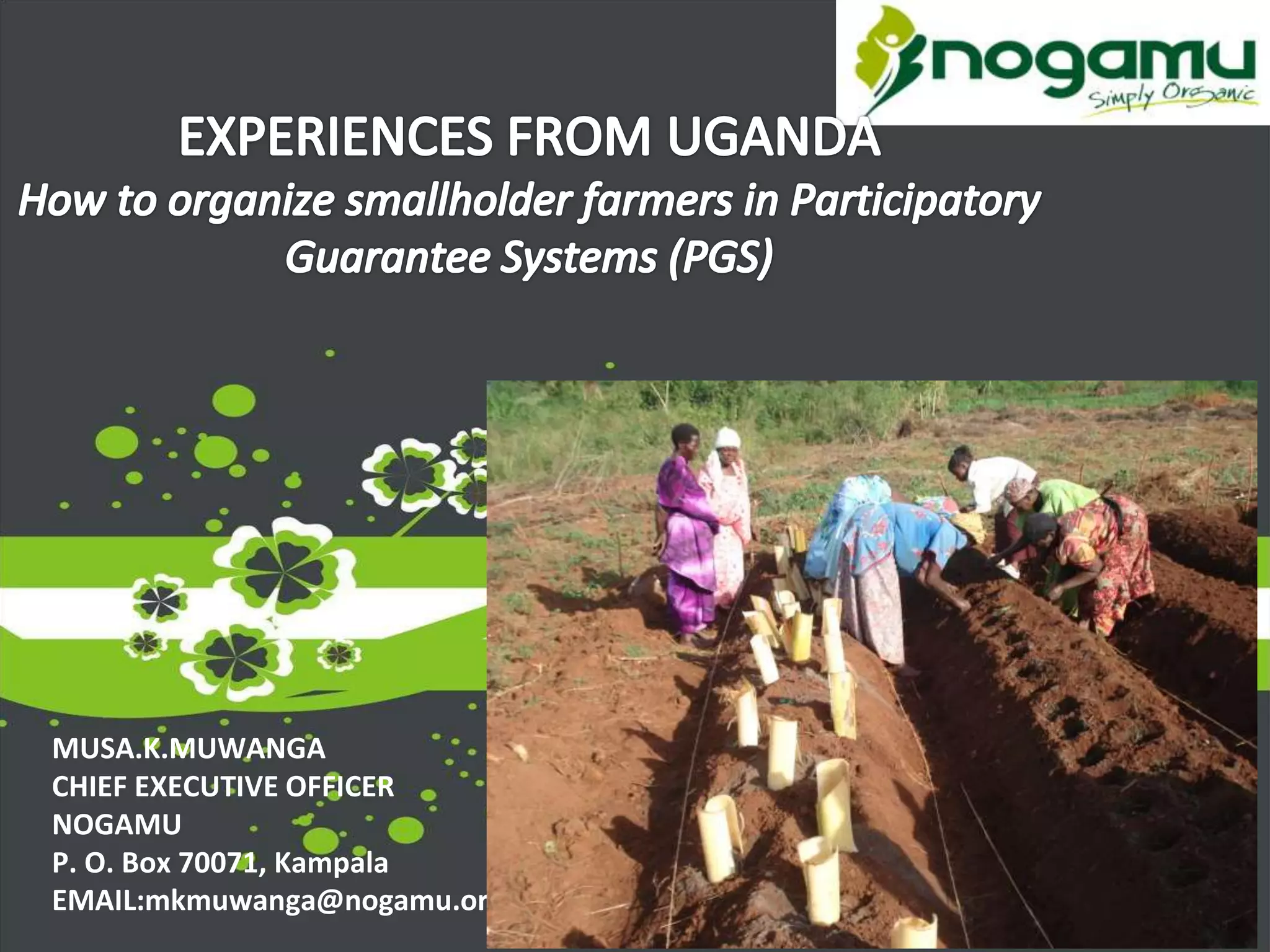 Participatory Guarantee Systems (PGS) are alternative certification systems for organic smallholder farmers that involve direct participation by stakeholders in certifying organic production and processing. PGS were developed as a low-cost option for small farms serving local markets. In Uganda, several PGS groups have been established since 2007 when PGS was adopted as an alternative to costly third-party certification. Examples are provided of existing PGS groups ranging in size from 23 to 1250 approved farmers. Key aspects of establishing and managing a successful PGS group are outlined.