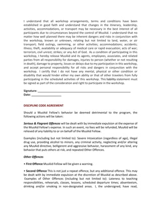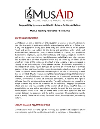 This document outlines the responsibility statement and liability release for MusAid fellows participating in a teaching fellowship program in Belize in 2015. It states that MusAid is not responsible for any issues related to third party services and accepts no liability for injuries, damages, or losses due to various factors outside its control. It requires fellows to sign a liability release acknowledging the inherent risks in the program and releasing MusAid from responsibility for any damages or losses due to participation. The document also describes the discipline code for fellows, including immediate expulsion for serious offenses.
