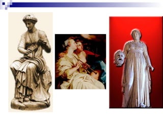 MELPOMENE (tragedia)Tragediaren musa da. Eskuan maskara tragika bat, buruan mashats- ostoak eta oinetan koturnoak( zapata altuak) eramaten irudikatu dute.