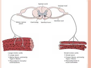 This document provides information on various topics related to muscle action and work. It discusses different types of muscle contraction including isotonic, isometric, and isokinetic contractions. It also describes muscle contraction facts related to the cross-bridge cycle during concentric, eccentric, and isometric contractions. Additionally, it covers motor units, recruitment strategies, and factors that affect active muscle tension generation.