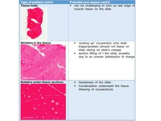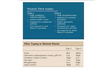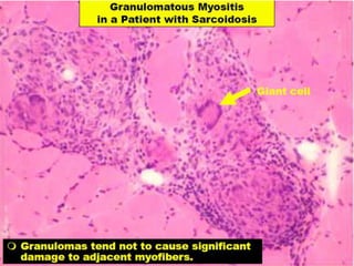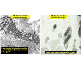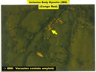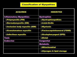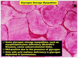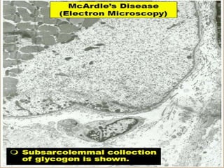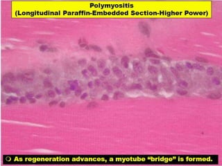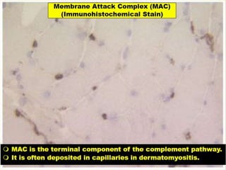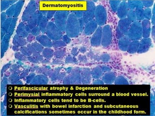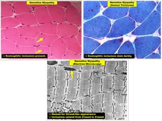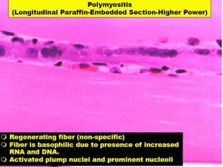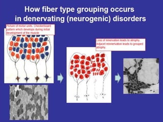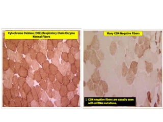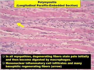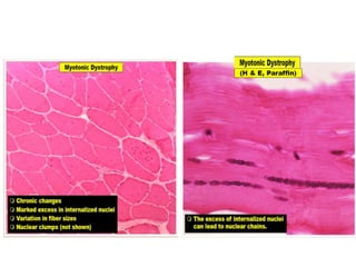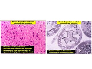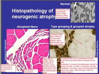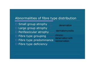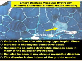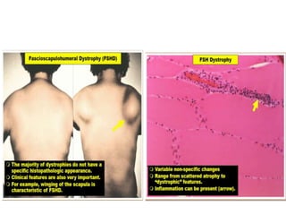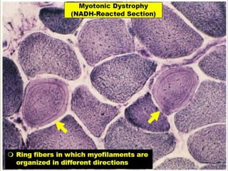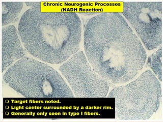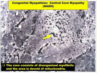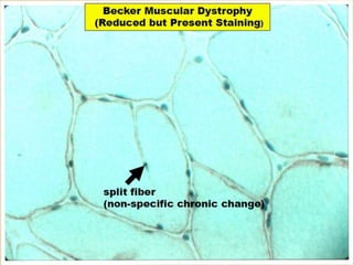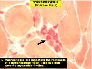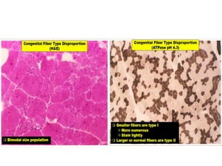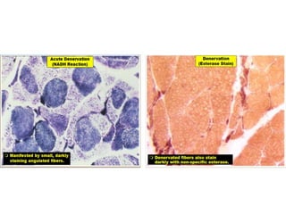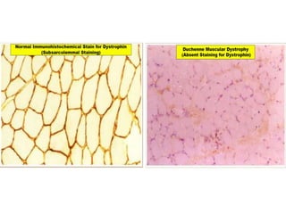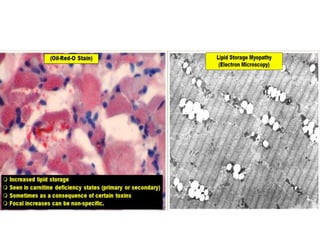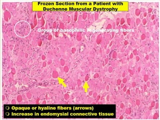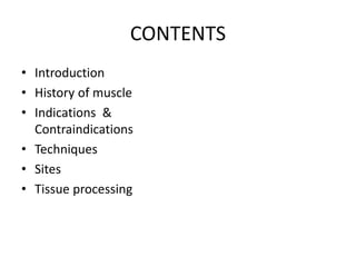 This document provides an overview of muscle biopsy procedures. It discusses the history and development of muscle biopsy techniques from the 1860s onward. It describes the indications and contraindications for muscle biopsy and lists ideal biopsy sites. The key techniques of open biopsy, Bergstrom needle biopsy, and spring-loaded micro-biopsy are outlined. Proper tissue handling, processing, freezing, and staining methods are explained to ensure diagnostic quality. Finally, the document reviews common stains used to interpret muscle biopsy samples under the microscope, including H&E, ATPase, NADH, and SDH, and provides examples of normal muscle histology.