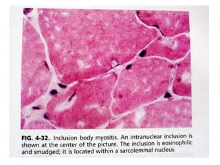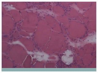 This document provides information about muscle biopsy techniques and interpretation. It discusses how muscle biopsy can help diagnose muscle diseases based on microscopic examination. Key points include: