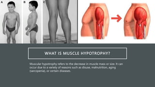 Muscle hypotrophy and atrophy refer to decreases in muscle mass. Hypotrophy is a decrease in size, while atrophy is a loss of muscle tissue. Atrophy can result from inactivity, aging, malnutrition or disease. Diagnosis involves medical history, exams, and tests like blood tests, imaging, and biopsies. Treatment focuses on exercise, nutrition, physical therapy, and treating any underlying causes. Case studies showed how genetic disorders can cause unusual hypotrophy or neurological disorders can lead to progressive atrophy.