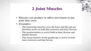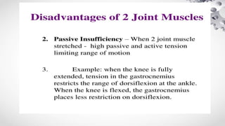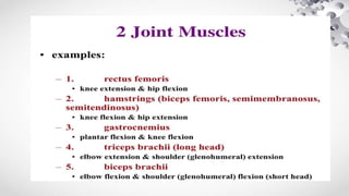 The document provides an overview of muscle mechanics, including types of muscles, muscle contractions, and classifications based on various factors. It discusses muscle action (agonists, antagonists, synergists, and fixators), active and passive insufficiency, and the significance of muscle orientation and angle of pull in functional movement. Additionally, it offers recommendations for exercises that consider these principles to enhance training outcomes.