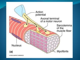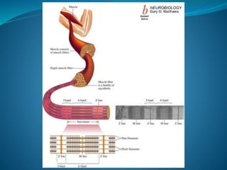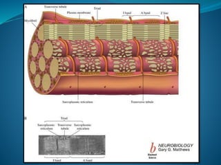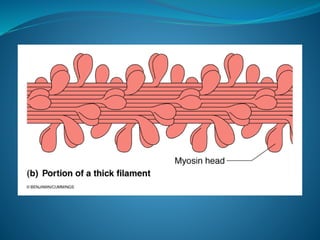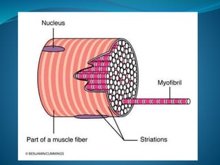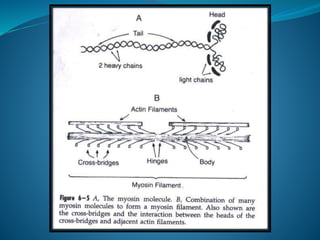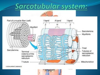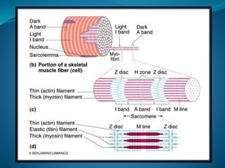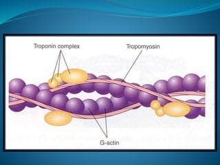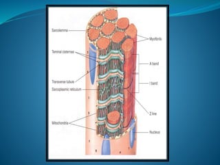 Skeletal muscle consists of cylindrical, multinucleated fibers that contain myofibrils made up of actin and myosin filaments, which form striations visible under a microscope. The sarcotubular system, including T-tubules and the sarcoplasmic reticulum, plays a crucial role in spreading action potentials and releasing calcium ions necessary for muscle contraction. Key muscle proteins include myosin, actin, tropomyosin, and troponin, which regulate the contraction process.