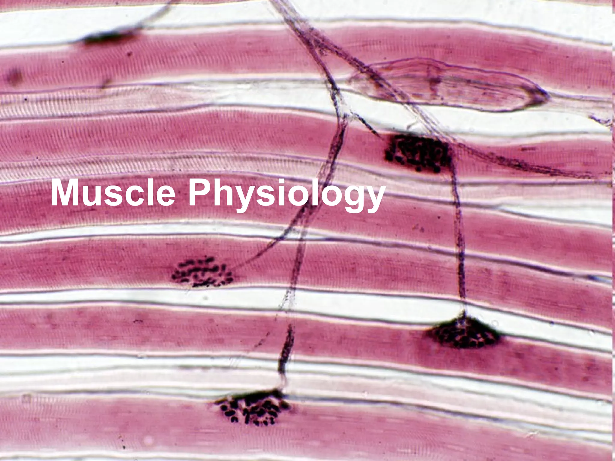 The document outlines muscle physiology, discussing the three main types of muscle tissue - skeletal, cardiac, and smooth muscle. It focuses on skeletal muscle, describing its general functions including movement, protection, and posture maintenance. The functional anatomy of skeletal muscle is explained down to the sarcomere level. The physiology of skeletal muscle contraction is summarized in three steps: 1) events at the neuromuscular junction, 2) the excitation-contraction coupling process, and 3) the contraction-relaxation cycle at the sarcomere level.