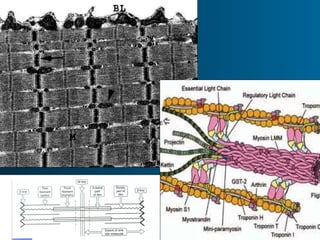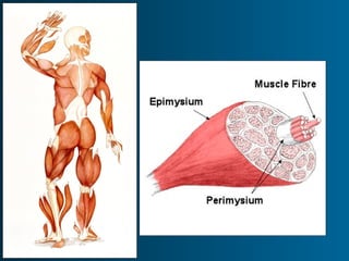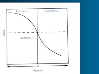 This document discusses muscle structure and function, different types of muscle fibers, and exercise physiology. It provides details on muscle fiber components like myofibrils, sarcomeres, and proteins. It also covers topics like muscle fiber types, contraction types, Frank-Starling law, and therapeutic exercises for conditions like low back pain, shoulder replacement, and ACL reconstruction. The key goals of exercise therapy are to increase mobility, strength, endurance, and proprioception while preventing deconditioning. Exercises must be tailored based on a person's pain pattern and underlying pathology.