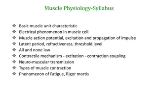 This document provides information about muscle physiology and the structure of muscle fibers at the microscopic level. It discusses the basic units of muscles including myofibrils, myofilaments, sarcomeres, and the proteins actin and myosin that make up the thin and thick filaments. It describes the striated banding pattern visible in muscle fibers due to the organized arrangement of these contractile proteins. It also covers concepts related to muscle membrane potential including ion gradients and the role of the sodium-potassium pump in establishing the resting potential.