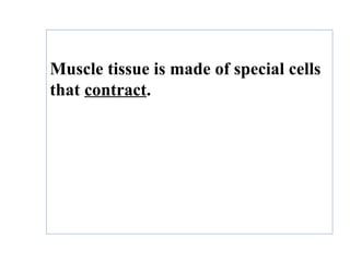 Muscle tissue is composed of cells called muscle fibers that are bundled together in groups. Individual muscle fibers are very thin but can be up to 10 inches long. Muscle fibers are bundled into fascicles, which are grouped together and surrounded by connective tissue called endomysium. Fascicles are then bundled into larger groups surrounded by perimysium. The entire muscle bundle is covered in a layer of connective tissue called the epimysium. At each end of the muscle, the connective tissues come together to form a tendon or aponeurosis, which attach muscles to bones or distribute their force over a larger area.
