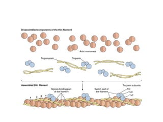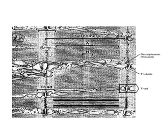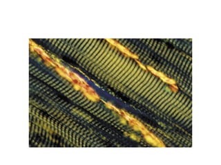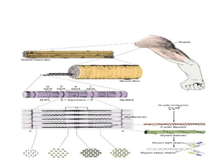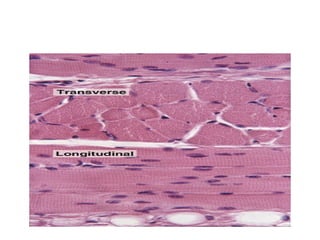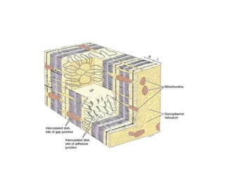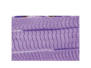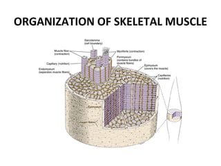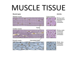 Skeletal muscle tissue is organized into bundles of fibers called fascicles. Cardiac muscle is found only in the heart and forms an interconnected network. Smooth muscle is found in organs and blood vessels and its cells are elongated and branching unlike striated skeletal and cardiac muscle.