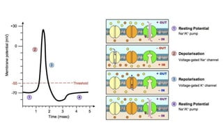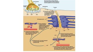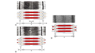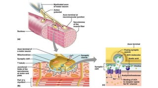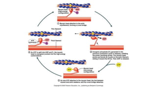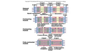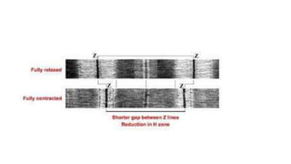 This document summarizes the key components of muscle tissue and muscle contraction. It discusses nerve impulses, motor units, neuromuscular junctions, and the sliding filament theory of muscle contraction. The main components that allow for contraction are described, including myosin, actin, tropomyosin, troponin, and the calcium release initiated by a nerve impulse that allows for crossbridge binding and sarcomere shortening. Regions of the sarcomere such as the Z-line, A-band, I-band, H-zone, and M-line are also outlined.