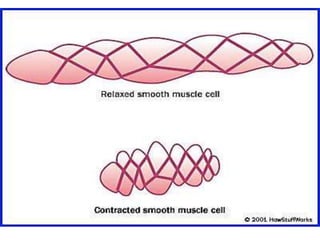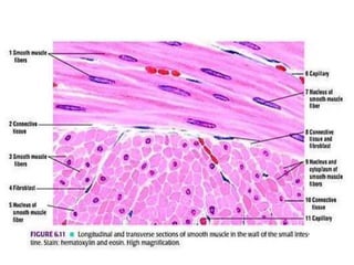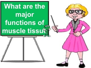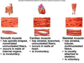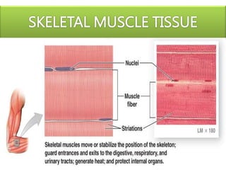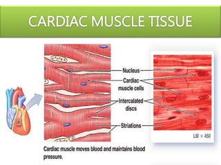 Muscle tissue has four main characteristics - excitability, contractility, extensibility, and elasticity - that allow it to perform important functions like movement, posture, and temperature regulation. There are three main types of muscle tissue: skeletal muscle, which is voluntarily controlled and enables movement; smooth muscle, which controls involuntary functions like digestion; and cardiac muscle, which pumps blood through the heart and circulatory system. Each muscle type has distinct cellular features related to their roles and methods of electrical and chemical stimulation to cause contraction.