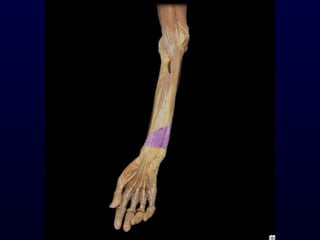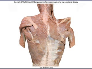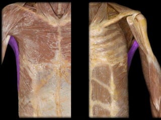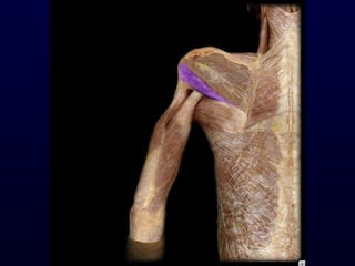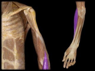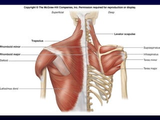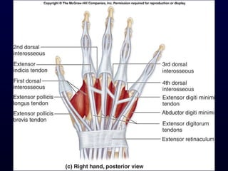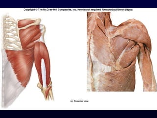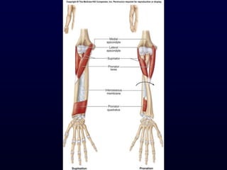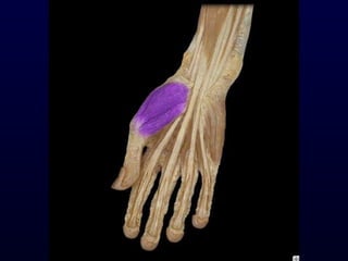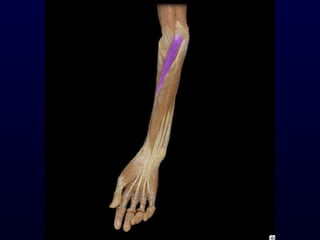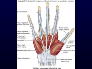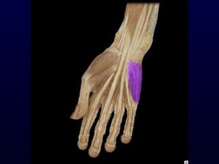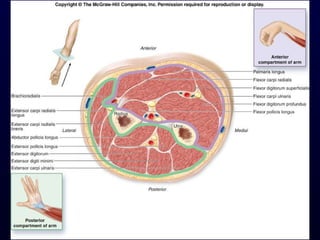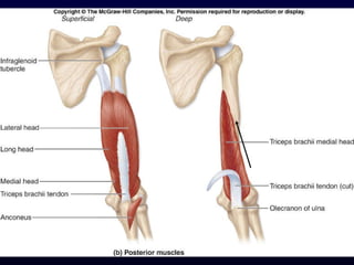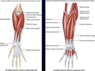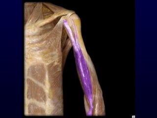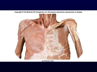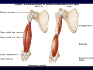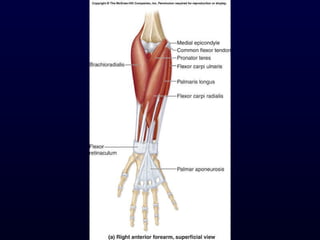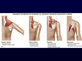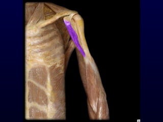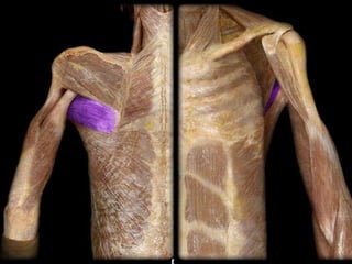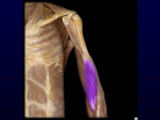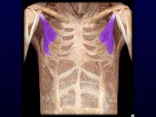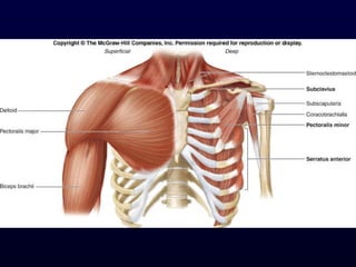 The document details the anatomy and functions of the muscles associated with the pectoral girdle and upper extremity, categorizing them into five groups based on their movements. It includes specific muscles such as pectoralis minor, trapezius, and biceps brachii, along with their origins, insertions, and primary actions. Additionally, it highlights the compartments of the arm, the intrinsic muscles of the hand, and structural features such as the carpal tunnel.