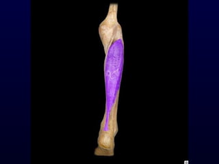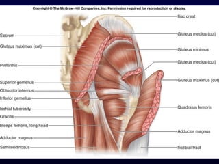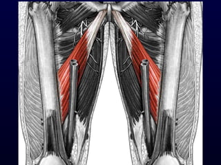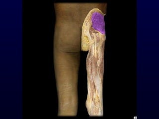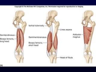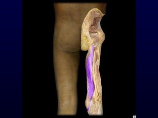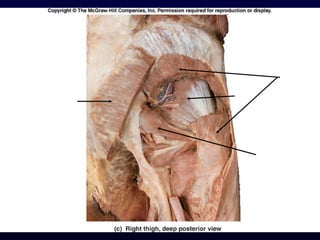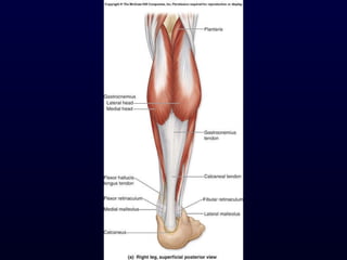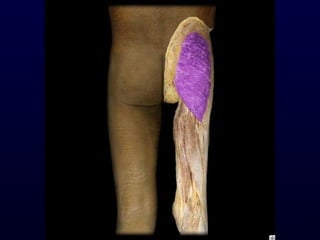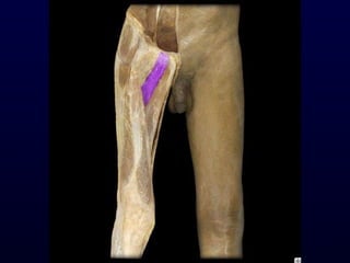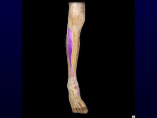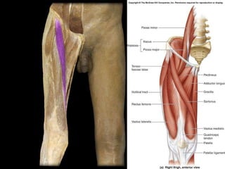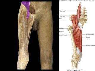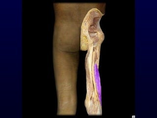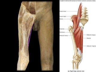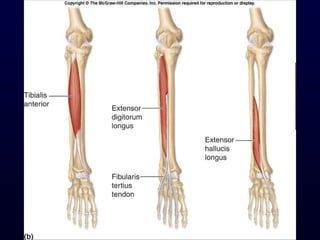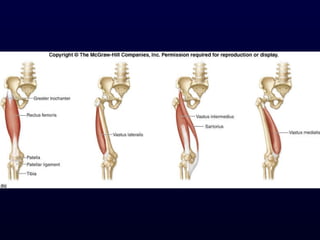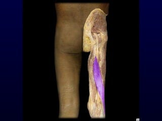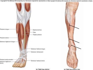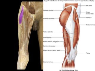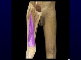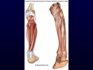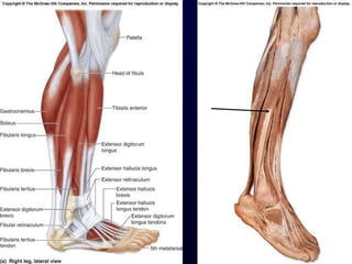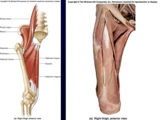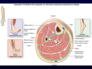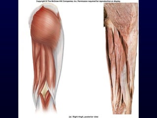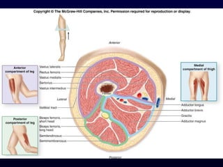The document details the muscles of the thigh and leg, including their compartments and actions. It identifies the major muscle groups and associated actions for movement related to the hip, knee, and foot, structured by compartment (anterior, medial, lateral, and posterior). Additionally, it lists origins and insertions for various muscles, emphasizing their functional roles.