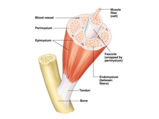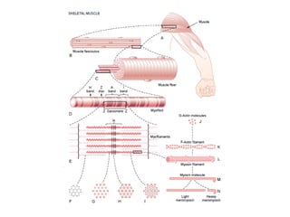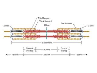 This document summarizes the key properties and functions of the three main types of muscle tissue: skeletal, cardiac, and smooth muscle. It describes their locations, structures, contraction mechanisms, and functions. Skeletal muscle is striated and voluntary, attaching to bones via tendons to enable movement. Cardiac muscle is also striated and pumps blood throughout the body. Smooth muscle is non-striated and involuntary, found in organs to enable processes like digestion. The document provides detailed descriptions of muscle fibers, sarcomeres, calcium handling, and more.