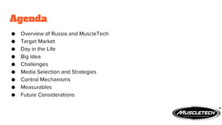 This document outlines a marketing plan for Muscletech in Russia. It discusses brand overviews for Muscletech and the Russian market, emerging trends in Russia, target markets, and a proposed big idea featuring Russian athletes to promote Muscletech products. Execution strategies are proposed, including online and out of home creative mockups. Metrics and future opportunities are also reviewed.