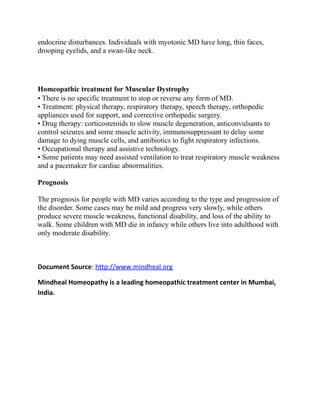 Muscular dystrophy is a group of disorders characterized by progressive muscle weakness and degeneration, varying in onset, severity, and inheritance patterns. Common types include Duchenne MD, Becker MD, facioscapulohumeral MD, and myotonic MD, with varying symptoms and prognoses. While there is no cure, treatments focus on managing symptoms through therapies, medications, and supportive technologies.