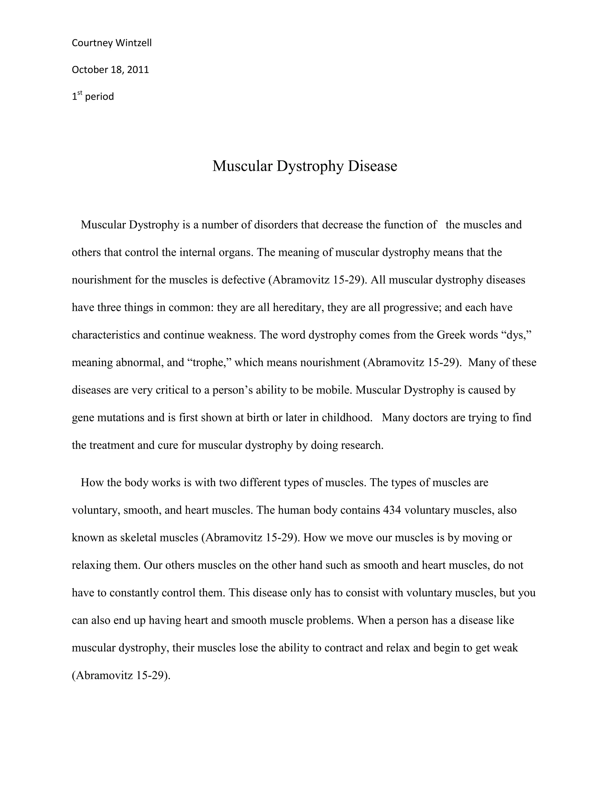 Courtney Wintzell October 18,2011 1st period Muscular Dystrophy Disease Muscular Dystrophy is a number of disorders that decrease the function of the muscles and others that control the internal organs. The meaning of muscular dystrophy means that the nourishment for the muscles is defective (Abramovitz 15-29). All muscular dystrophy diseases have three things in common: they are all hereditary, they are all progressive; and each have characteristics and continue weakness. The word dystrophy comes from the Greek words “dys,” meaning abnormal, and “trophe,” which means nourishment (Abramovitz 15-29). Many of these diseases are very critical to a person’s ability to be mobile. Muscular Dystrophy is caused by gene mutations and is first shown at birth or later in childhood. Many doctors are trying to find the treatment and cure for muscular dystrophy by doing research. How the body works is with two different types of muscles. The types of muscles are voluntary, smooth, and heart muscles. The human body contains 434 voluntary muscles, also known as skeletal muscles (Abramovitz 15-29). How we move our muscles is by moving or relaxing them. Our others muscles on the other hand such as smooth and heart muscles, do not have to constantly control them. This disease only has to consist with voluntary muscles, but you can also end up having heart and smooth muscle problems. When a person has a disease like muscular dystrophy, their muscles lose the ability to contract and relax and begin to get weak (Abramovitz 15-29).