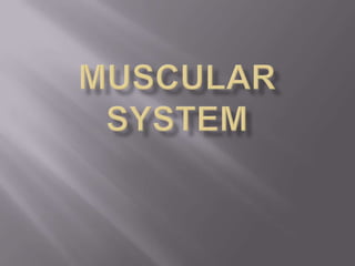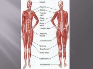 The document discusses the three main types of muscles in the human body: skeletal muscles, which allow movement and maintain posture; smooth muscles, which are found in internal organs and blood vessels; and cardiac muscle, which is found only in the heart and causes it to beat. Each muscle type has distinct characteristics and functions.
