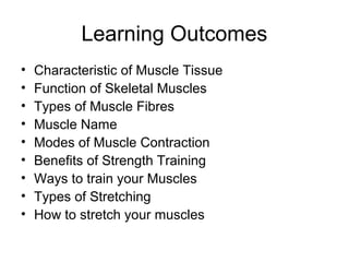 This document provides information about the skeletal muscle system. It discusses the characteristics of muscle tissue including excitability, contractility, extensibility, and elasticity. It also describes the functions of skeletal muscles in producing movement, maintaining posture and temperature. Different muscle fiber types, muscle names, and contraction modes are outlined. The benefits of strength training and ways to train specific muscles through exercises are explained. Finally, the importance of stretching and different stretching techniques are covered.