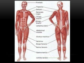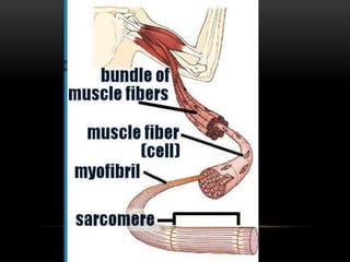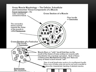 This document discusses muscles and the muscular system. It begins by defining muscles and describing the various classifications of muscles. The key types are skeletal muscles, which are striated and voluntary. Skeletal muscles have origins, insertions, and bellies. They act to produce movement, maintain posture and support, and generate heat. The document outlines the structure of muscles and their components. It also categorizes muscles based on shape, function, and other characteristics.