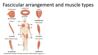 This document provides an overview of the muscular system, including muscle types, actions, and examples of lever systems. It describes how muscle attachments determine their actions and lists common movement terms. Finally, it details the major skeletal muscles in the head, upper arm, forearm, hand, respiratory system, abdomen, pectoral girdle, leg, ankle, and foot. It concludes with a brief overview of common muscular system diseases.