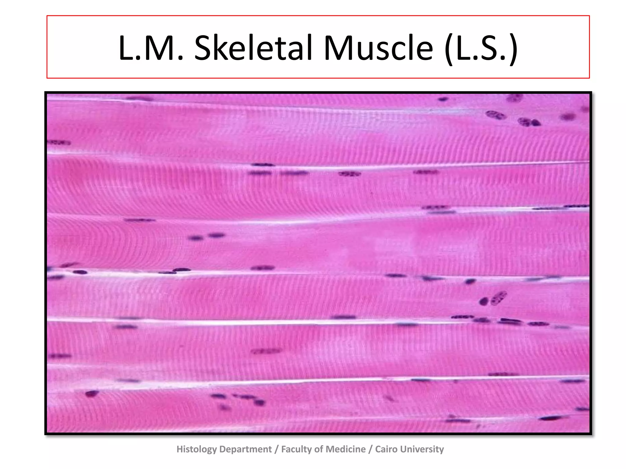 This document contains labels from microscope slides from the Histology Department at Cairo University's Faculty of Medicine. The slides include longitudinal sections and transverse sections of skeletal muscle as well as cardiac muscle and a heart valve. The cardiac muscle slide is labeled with the layers of the myocardium, fibrous connective tissue, supporting layer, and endothelium.