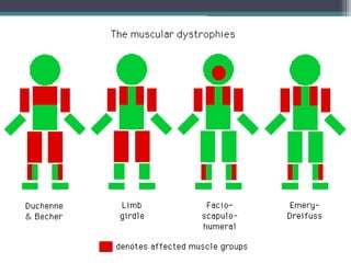 Muscular dystrophy is a heterogeneous group of inherited disorders characterized by progressive muscle weakness and loss of muscle tissue. There are several classifications including sex-linked, autosomal recessive, and autosomal dominant forms that depend on the causative gene, age of onset, and symptoms. Duchenne muscular dystrophy is the most common and severe type that primarily affects males, causes muscle degeneration starting in childhood, and leads to death in the third decade without treatment. Other forms include limb-girdle, facioscapulohumeral, and congenital muscular dystrophies that have varying inheritance patterns, muscle involvement, and progression of symptoms. Treatment focuses on managing symptoms and complications to maximize quality of life.