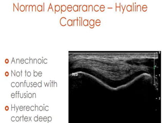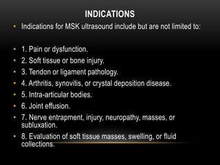 This document provides an overview of musculoskeletal ultrasound. It discusses the main indications for MSK ultrasound including pain, injury, arthritis and more. It describes the equipment used, including high frequency linear transducers of at least 7.5MHz. Proper probe placement and understanding anisotropy are important. The document outlines how different musculoskeletal tissues like muscle, tendons, ligaments, nerves, cartilage and bones appear on ultrasound. It provides details on anatomy and ultrasound characteristics of these various tissues.