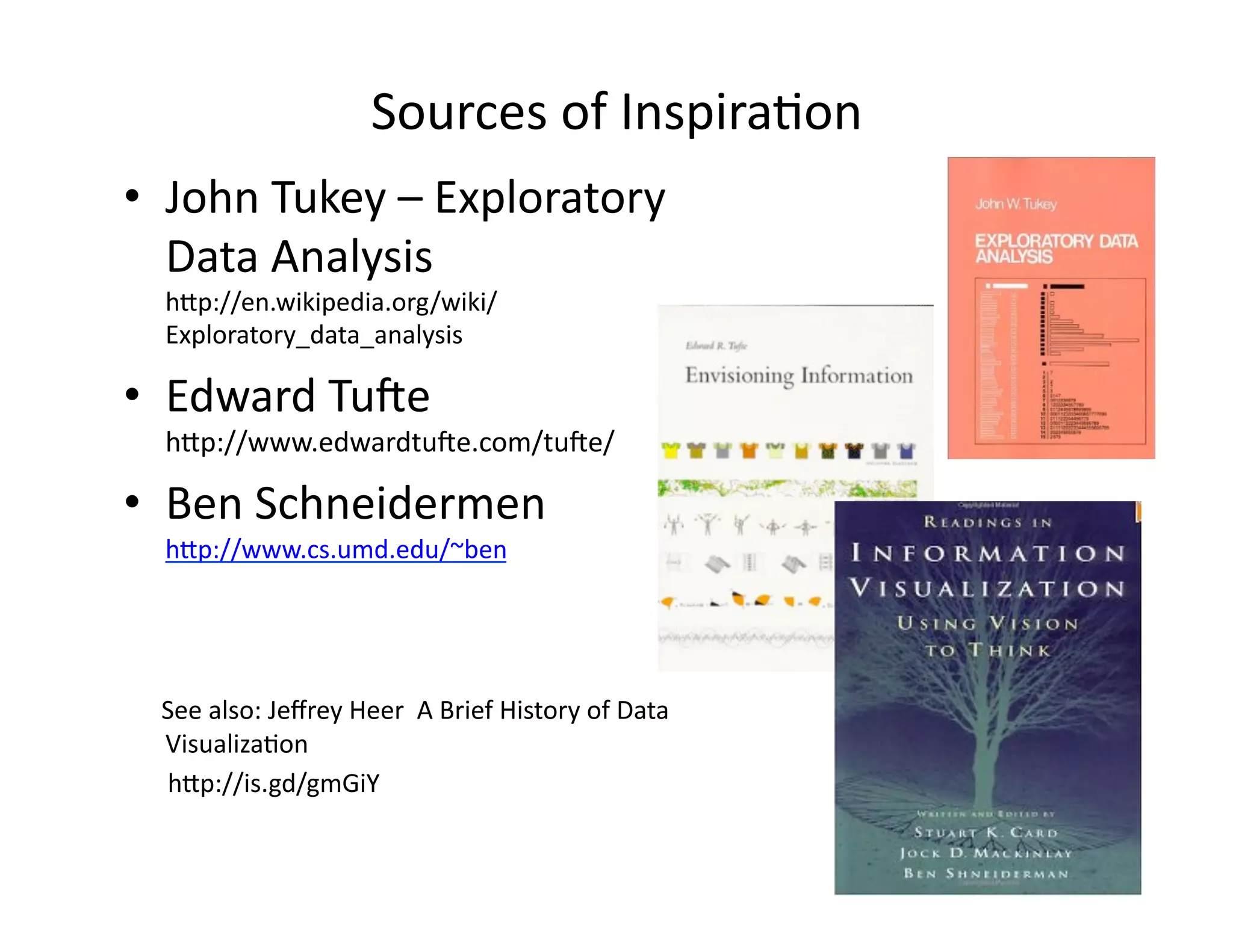 The document outlines various sources and tools related to data visualization, emphasizing exploratory techniques and the democratization of visualization methods. It references notable figures and projects, such as John Tukey and the Baby Name Voyager, while exploring the intersection of visualization and the humanities. Additionally, it includes links to various resources for collaborative visualization and cultural analytics.